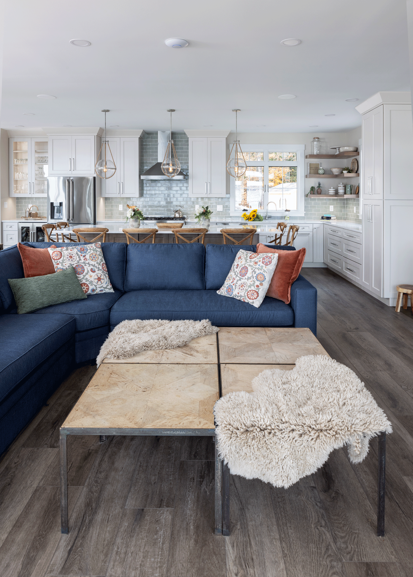A striking navy L-shaped sectional pairs with sheepskin-covered leather swivel chairs that pivot effortlessly between tableside chats and serene lake views, providing ample seating for 10. Decorative poufs tucked under the sofa table add versatility, serving as additional seating or footrests. An oversized coffee table, cleverly crafted from four smaller pieces to complement the couch's long dimensions, offers a custom touch. It doubles as a sturdy surface for food, drinks, and games, while soft animal pelts draped over its corners transform it into a cozy ottoman, blending rustic charm with practical function.