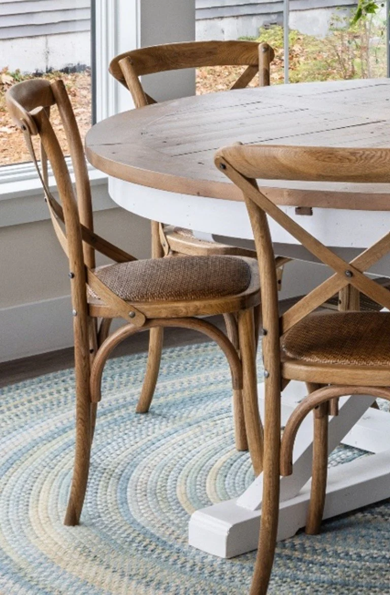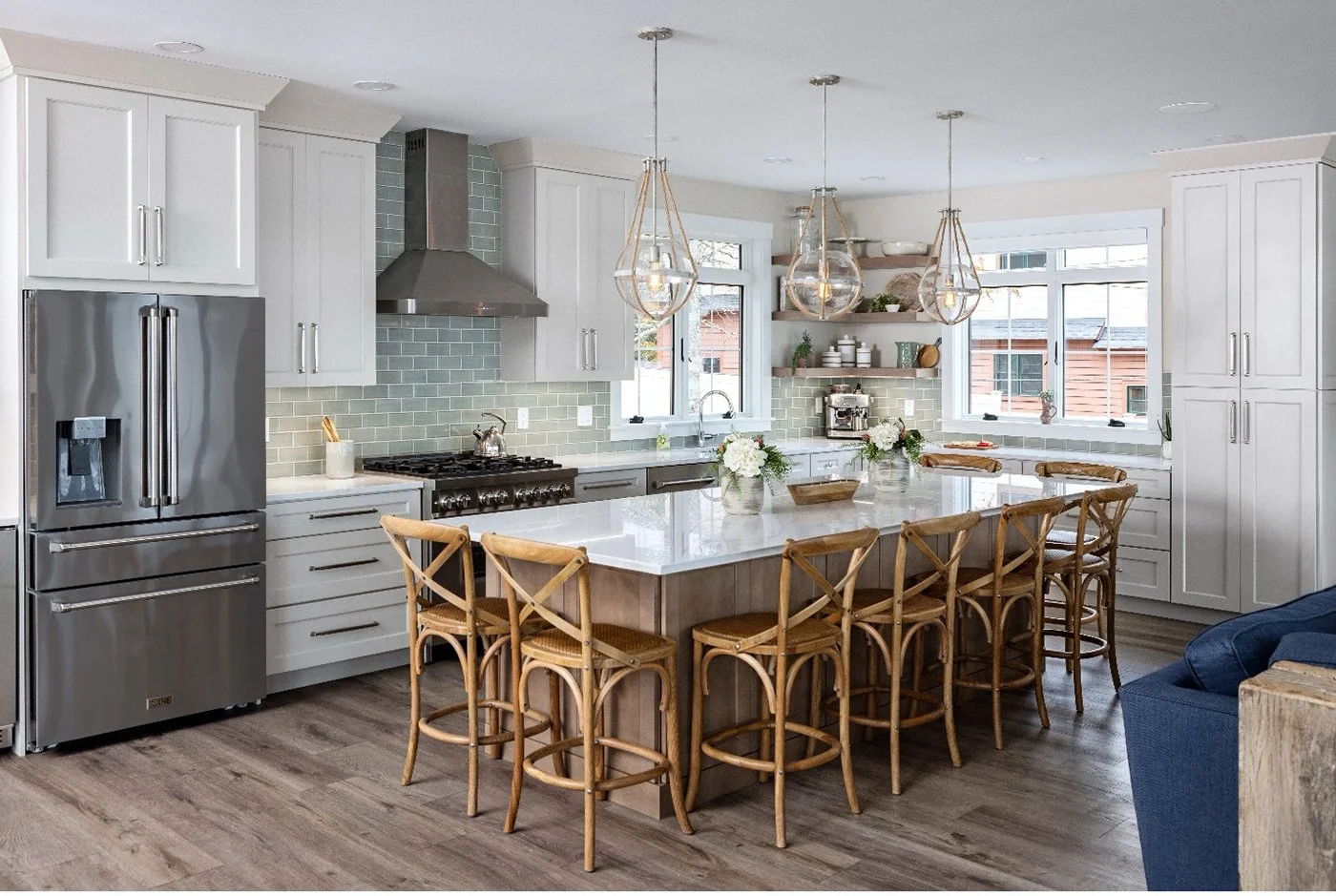 Textural elements like rope-supported glass globe pendants over the island, basketweave dining and kitchen chairs, cane-woven furniture, and curated lake-inspired décor come together to create a breezy, organic, and cohesive aesthetic.