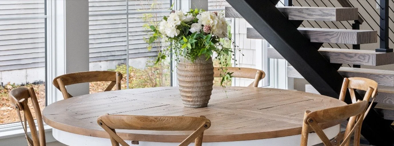 Floor-to-ceiling windows frame the home's landscape, anchoring the interior to its stunning surroundings. A playful mix of fresh blooms, lifelike silks, and lush greenery adds softness to the bold lines of the furniture, while textured vases and driftwood wall panels bring a hint of earthy charm. These thoughtful touches set the stage for family roots to grow, blossom, and thrive.