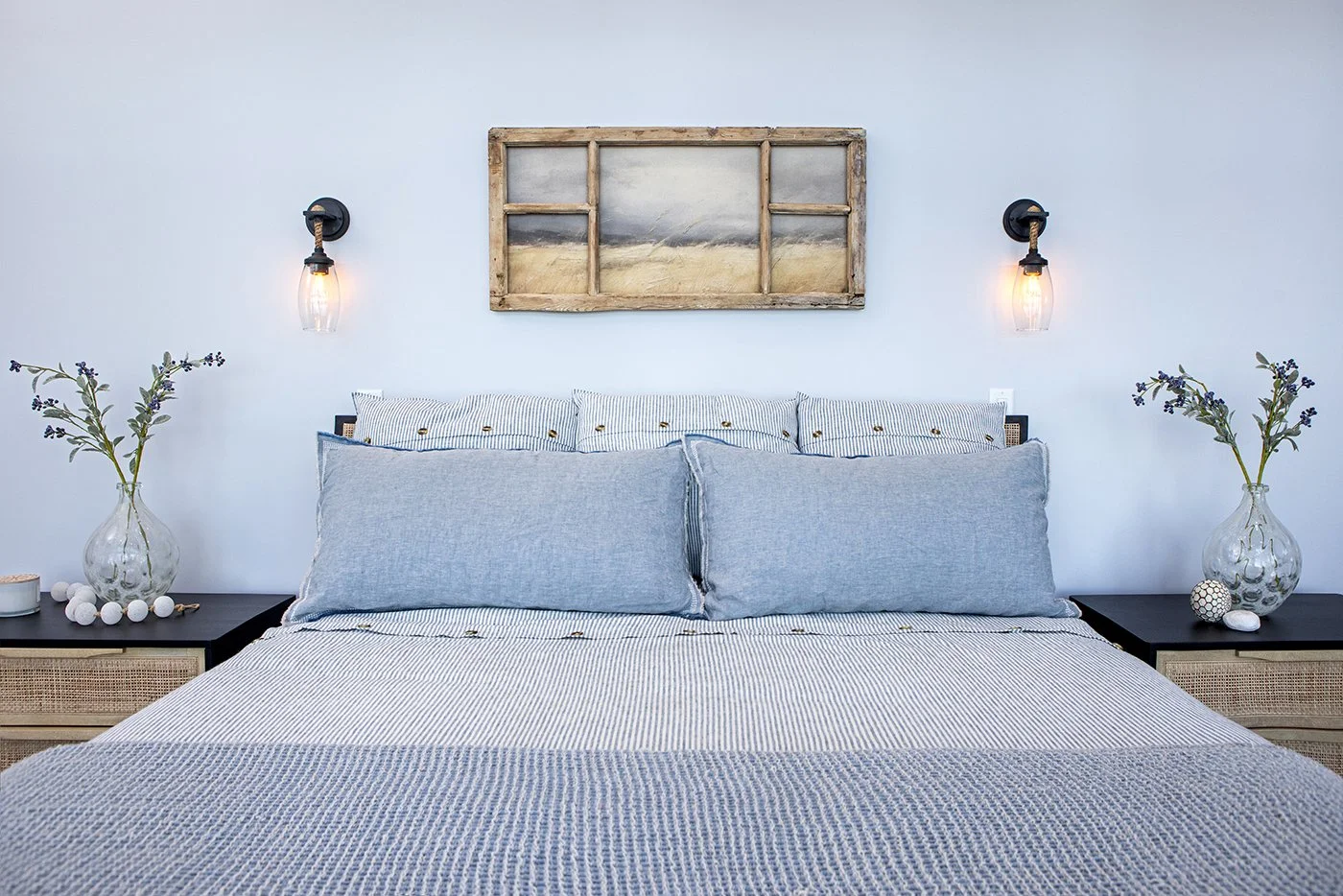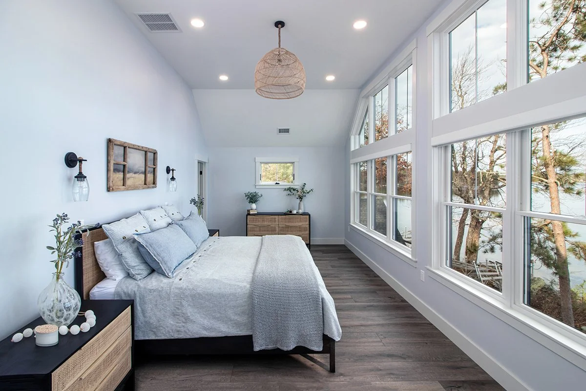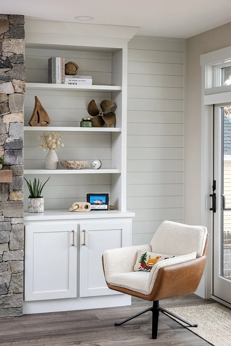 We see every piece as art in its own right. Here, the family room pillows whisper style on mini canvases—full of texture, earthy tones, and rich details while the chambray pillows in the bedroom say “It’s time to nap”. A mix of nautical and vintage industrial lighting scream modern lakeside farmhouse, while wall decor tells a story anchored in lakeside serenity. We incorporated a perfect mix of beauty and personality, grounded in peaceful charm.